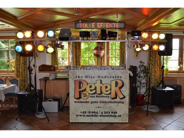 A Musi die jeden g'foit - für jung und oit. Mobile-Discothek Salzburg Mobile-Disco Salzburg Disc-Moderator Peter Rebhan 3 eigene Ton- und Lichtanlagen über 25 Jahre Erfahrung, über 300 Hochzeiten, Musik aus allen Jahreszeiten; Disc-Moderator Peter sit 1983, Lederhosenpeter, Silvestergala in Saalbach;, Homepage : www.mobile-Discothek.at; Telefonnummer : +43 (0) 664 / 4 323 646 oder +43 (0) 662 / 85 63 82, e-Mailadresse : peters@mobile-discothek.at; DJ Peter, Hochzeitsspiele;