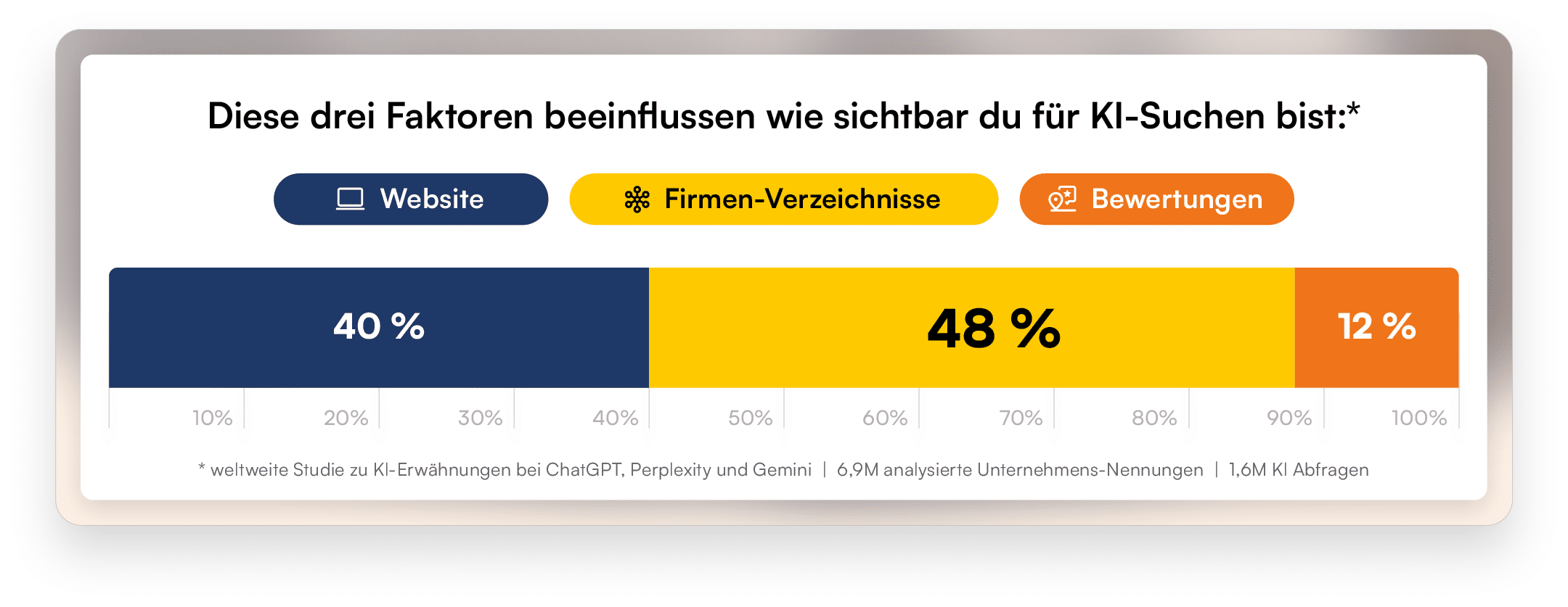 Online sichtbar sein 04. November 2025 | Christian Wawer Sichtbarkeit in KI-Suchen: Darum sind Firmen-Verzeichnisse wichtiger denn je Sichtbarkeit in KI-Suchen: Darum sind Firmen-Verzeichnisse wichtiger denn je KI-Suchen haben die Art, wie Menschen im Internet nach Unternehmen, Produkten und Dienstleistungen suchen, rasant verändert. Das bedeutet: Wer in dieser neuen KI-Suchwelt gefunden werden will, muss seine digitale Präsenz anpassen. Und ein zentraler Baustein dabei sind gepflegte und glaubwürdige Firmeneinträge in hochwertigen Firmen-Verzeichnissen. Erfahre in diesem Beitrag was dafür notwendig ist. Inhaltsverzeichnis Warum KI-Sichtbarkeit für Unternehmen jetzt entscheidend istDie 3 zentralen Faktoren der KI-SichtbarkeitWarum gepflegte Firmeneinträge so entscheidend für Sichtbarkeit in KI-Suchen sindHerold.at ist das relevanteste Firmen-Verzeichnis ÖsterreichsGlaubwürdigkeit zählt für KI-Suchen – und Herold liefert sieWie Herold dir hilft deine KI-Sichtbarkeit zu steigernBonus-Tipp: (Vor)Reihungen auf Herold.atKostenloser Leitfaden: 3 Wege zu mehr Online-SichtbarkeitFazit: Wer in KI-Suchen sichtbar sein will braucht Sichtbarkeit in Firmen-VerzeichnissenHerold – dein Partner für mehr Online- & KI-Sichtbarkeit Warum KI-Sichtbarkeit für Unternehmen jetzt entscheidend ist Künstliche Intelligenz verändert nicht nur, wie gesucht wird sondern auch, was angezeigt wird. Während früher Suchmaschinen wie Google eine Liste von Websites ausgaben, liefern KI-Systeme konkrete Antworten – oft mit einer einzigen Empfehlung oder wenigen Quellen. Wenn also jemand ChatGPT fragt: „Welcher Installateur in Wien ist zuverlässig und in meiner Nähe?“ …dann durchsucht die KI nicht nur Webseiten, sondern vor allem strukturierte, vertrauenswürdige Daten aus Firmen-Verzeichnissen, Bewertungen und offiziellen Quellen. Die Konsequenz: Unternehmen, die dort mit vollständigen, aktuellen und glaubwürdigen Informationen vertreten sind, haben die besten Chancen, in diesen KI-Antworten aufzutauchen. Die 3 zentralen Faktoren der KI-Sichtbarkeit Eine aktuelle Studie von Yext (Yext Research 2025) zeigt eindrucksvoll: Drei Faktoren bestimmen maßgeblich, wie sichtbar ein Unternehmen in KI-Suchergebnissen ist: 3 Faktoren die Sichtbarkeit in KI-Suchen am meisten beeinflussen. Bild: © Herold Website – 40 %Eine moderne, technisch saubere und inhaltlich relevante Website ist das Fundament jeder Online-Präsenz. KI-Systeme lesen Webseiten nicht nur, sie verstehen sie und bewerten Struktur, Inhalt und Vertrauenssignale. Firmen-Verzeichnisse – 48 %Fast die Hälfte der KI-Sichtbarkeit entsteht über strukturierte Unternehmensdaten in glaubwürdigen Verzeichnissen. Diese Daten liefern die Grundlage, auf der KI-Systeme Unternehmen erkennen, verorten und bewerten. Bewertungen – 12 %Authentische Kundenbewertungen stärken das Vertrauen und erhöhen die Wahrscheinlichkeit, in KI-Suchen als Empfehlung genannt zu werden – besonders in lokalen Suchen. Zusammen ergibt das 100 % Sichtbarkeit in KI-Suchen. Und das Beste: Herold deckt den Großteil davon mit seinen Lösungen ab. Warum gepflegte Firmeneinträge so entscheidend für Sichtbarkeit in KI-Suchen sind Firmeneinträge sind längst nicht mehr nur eine digitale Visitenkarte – sie sind ein zentraler Baustein deiner Online-Reputation. Ein gepflegter Firmeneintrag in einem Namenhaften Firmen-Verzeichnis liefert: strukturierte, maschinenlesbare Daten (Name, Adresse, Telefonnummer, Öffnungszeiten, Leistungen usw.) Relevanz- und Vertrauenssignale für Suchmaschinen und KI-Systeme lokale Sichtbarkeit in deiner Region und (ganz wichtig) Kontrolle über deine Unternehmensdarstellung. Wenn diese Daten jedoch veraltet, unvollständig oder widersprüchlich sind, führt das zu Verwirrung – bei Kund:innen und bei KI-Systemen.Das kann dazu führen, dass dein Unternehmen nicht mehr als relevante Antwort erscheint, selbst wenn du eigentlich perfekt passen würdest. Herold.at ist das relevanteste Firmen-Verzeichnis Österreichs Wenn es um Online-Sichtbarkeit für Unternehmen in Österreich geht, führt kein Weg an Herold.at vorbei. Denn Herold.at ist nach wie vor das relevanteste Online-Firmen-Verzeichnis Österreichs. Ein paar Zahlen, die das unterstreichen: 1,06 Milliarden Google-Impressionen pro JahrDas macht Herold.at zum sichtbarsten Firmen-Verzeichnis Österreichs. Über 2 Millionen Zugriffe und Suchen pro MonatJeden Monat suchen Menschen auf HEROLD.at gezielt nach Unternehmen, Produkten und Dienstleistungen. Mehrere Millionen indexierte EinträgeKI-Systeme und Suchmaschinen greifen regelmäßig auf diese Daten zu, um Unternehmensinformationen zu validieren. Das bedeutet: Wer auf Herold.at mit seinem Unternehmen gelistet ist, ist bei lokalen Suchen nach Dienstleistungen im Internet sichtbar – und wird zunehmend auch in KI-Suchen empfohlen. 💡Schon gewusst? Du kannst auf Herold.at jederzeit kostenlos einen Firmeneintrag anlegen, um die Online-Sichtbarkeit deines Unternehmens zu steigern. Werde noch heute sichtbar in Österreichs größtem Online-Firmen-Verzeichnis. Glaubwürdigkeit zählt für KI-Suchen – und Herold liefert sie KI-Systeme werten nicht alle Quellen gleich. Sie bevorzugen offizielle, strukturierte und verifizierte Datenquellen. Herold erfüllt genau diese Kriterien: Verifizierte Unternehmensinformationen Regelmäßige Aktualisierung und Qualitätskontrolle Strukturierte Datenformate (maschinenlesbar für KI-Systeme) Hohe Domain Authority und Google-Vertrauen durch langjährige Online-Präsenz Das Zusammenspiel aus Reichweite, Glaubwürdigkeit und Datenqualität macht Herold zu einem der wichtigsten Faktoren für lokale Sichtbarkeit (und KI-Suchen-Sichtbarkeit) in Österreich. Wie Herold dir hilft deine KI-Sichtbarkeit zu steigern Herold bietet mit Online Complete eine Lösung, die deine Firmendaten automatisch über 50 Online-Plattformen hinweg schützt und synchronisiert. Vorteile: Deine Unternehmensdaten werden auf über 50 Platt